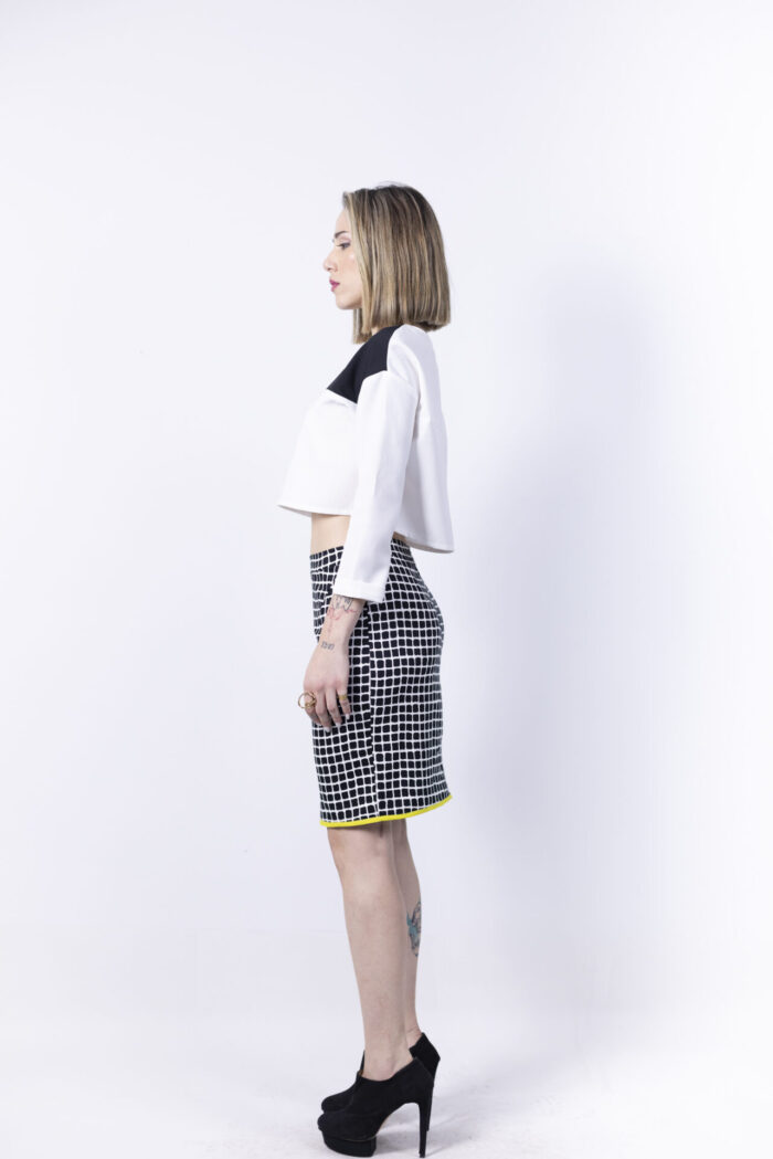 Το ασπρόμαυρο καρό print της χαρίζει διαχρονικό χαρακτήρα, ενώ η κίτρινη γραμμή στο τελείωμα του ποδόγυρου προσθέτει ένα ανατρεπτικό και ξεχωριστό twist στο look.