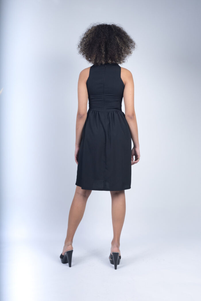 Ασπρόμαυρο φόρεμα με γεωμετρικά κοψίματα, αμάνικο, που φτάνει πάνω από το γόνατο. Η στρόγγυλη λαιμόκοψη προσφέρει μια κλασική και κομψή αίσθηση. Το non-stretch ύφασμα δίνει μια αυστηρή, αλλά κομψή γραμμή, ενώ το κλείσιμο στην πλάτη με κρυφό φερμουάρ εξασφαλίζει μια άψογη εφαρμογή. Το γεωμετρικό μοτίβο προσθέτει μια μοντέρνα και εντυπωσιακή διάσταση, κάνοντάς το ιδανικό για κάθε εμφάνιση.
