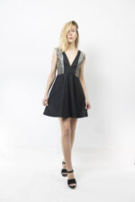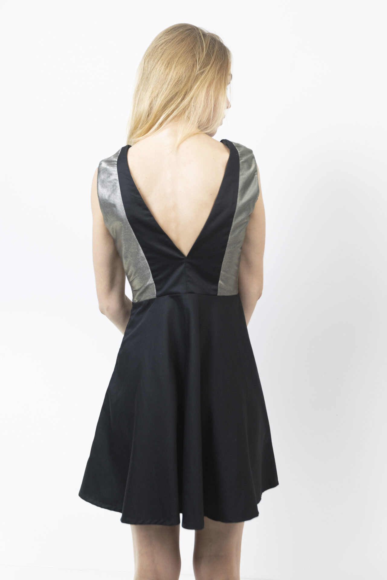 Αμάνικο φόρεμα με τολμηρό βαθύ V μπροστά και πίσω, σχεδιασμένο για να τραβάει τα βλέμματα.