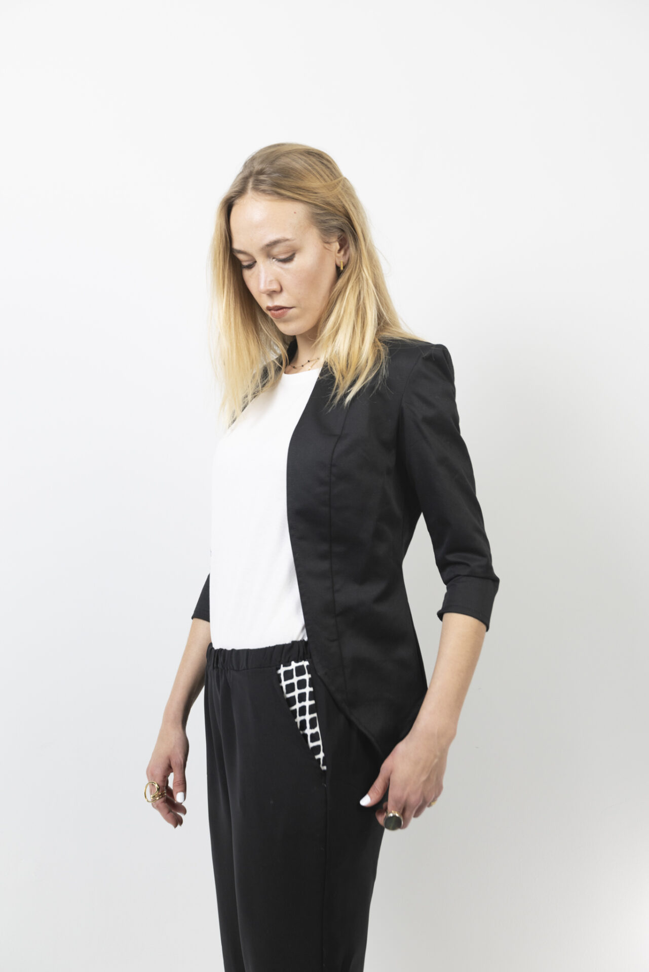 Η ιδιαίτερη λεπτομέρεια στις τσέπες με ασπρόμαυρο καρό σχέδιο προσθέτει χαρακτήρα στο minimal design, ενώ το ρεβέρ στο τελείωμα ολοκληρώνει το look.