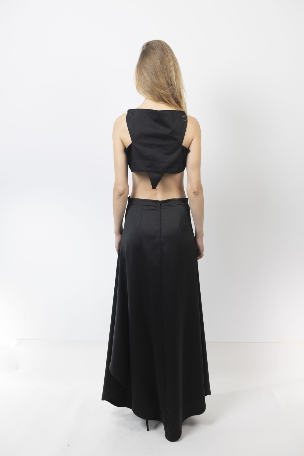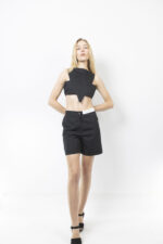 Το ιδιαίτερο τρίγωνο κόψιμο που καταλήγει στην κοιλιά αναδεικνύει τη σιλουέτα και προσθέτει έναν μοντέρνο, τολμηρό χαρακτήρα στο σύνολο, κάνοντάς το ιδανικό για εμφανίσεις που θέλουν να ξεχωρίζουν.