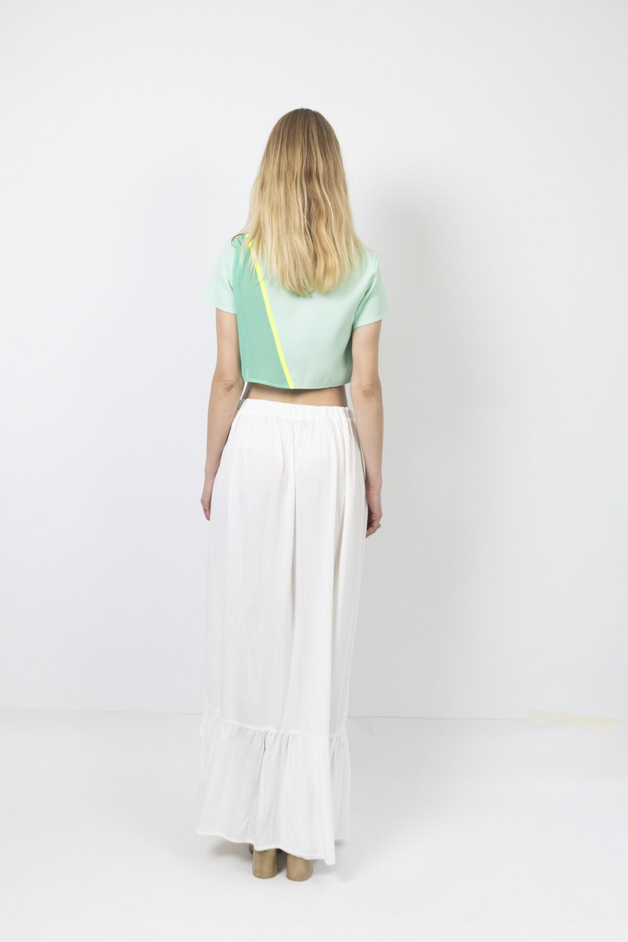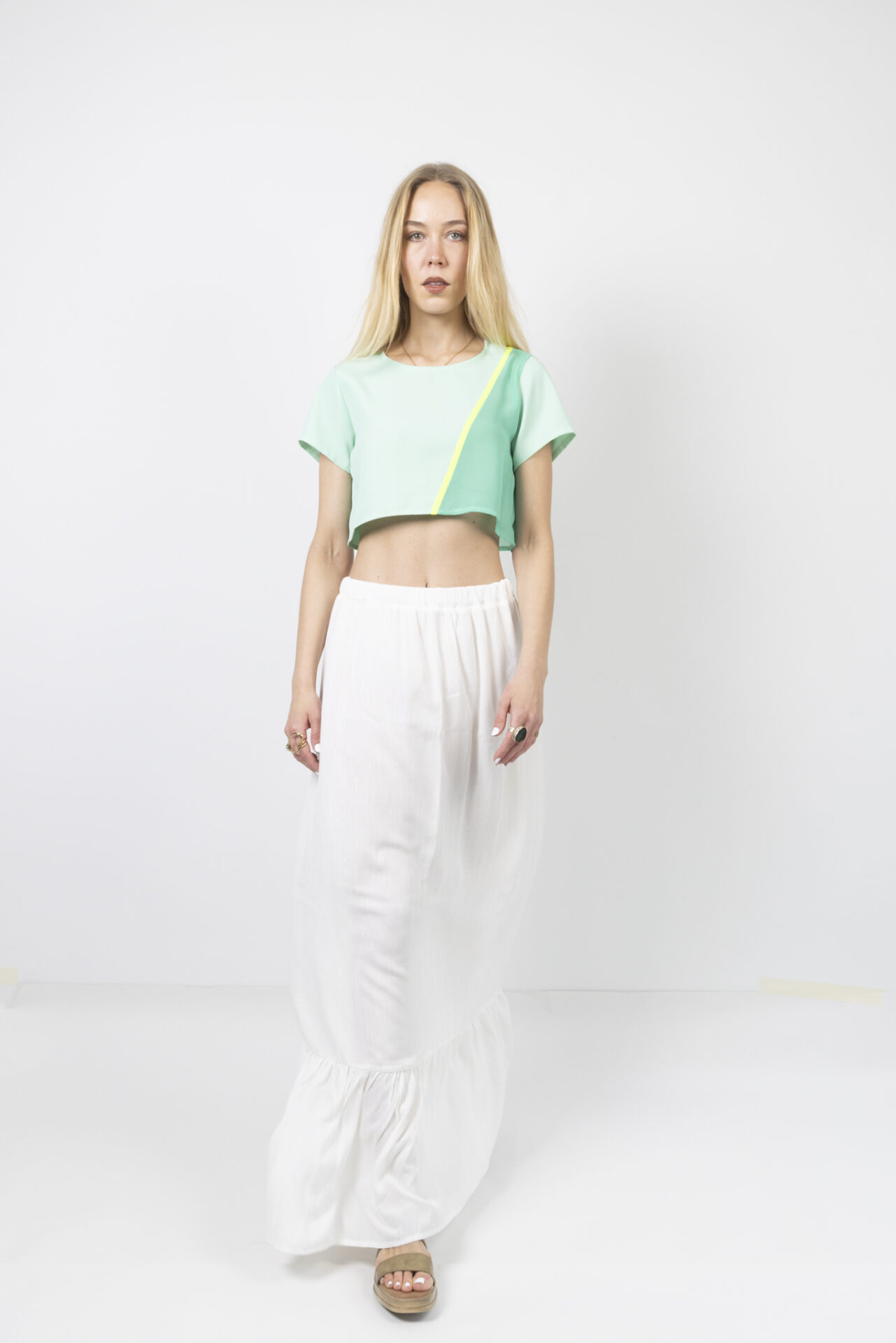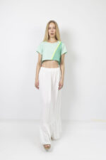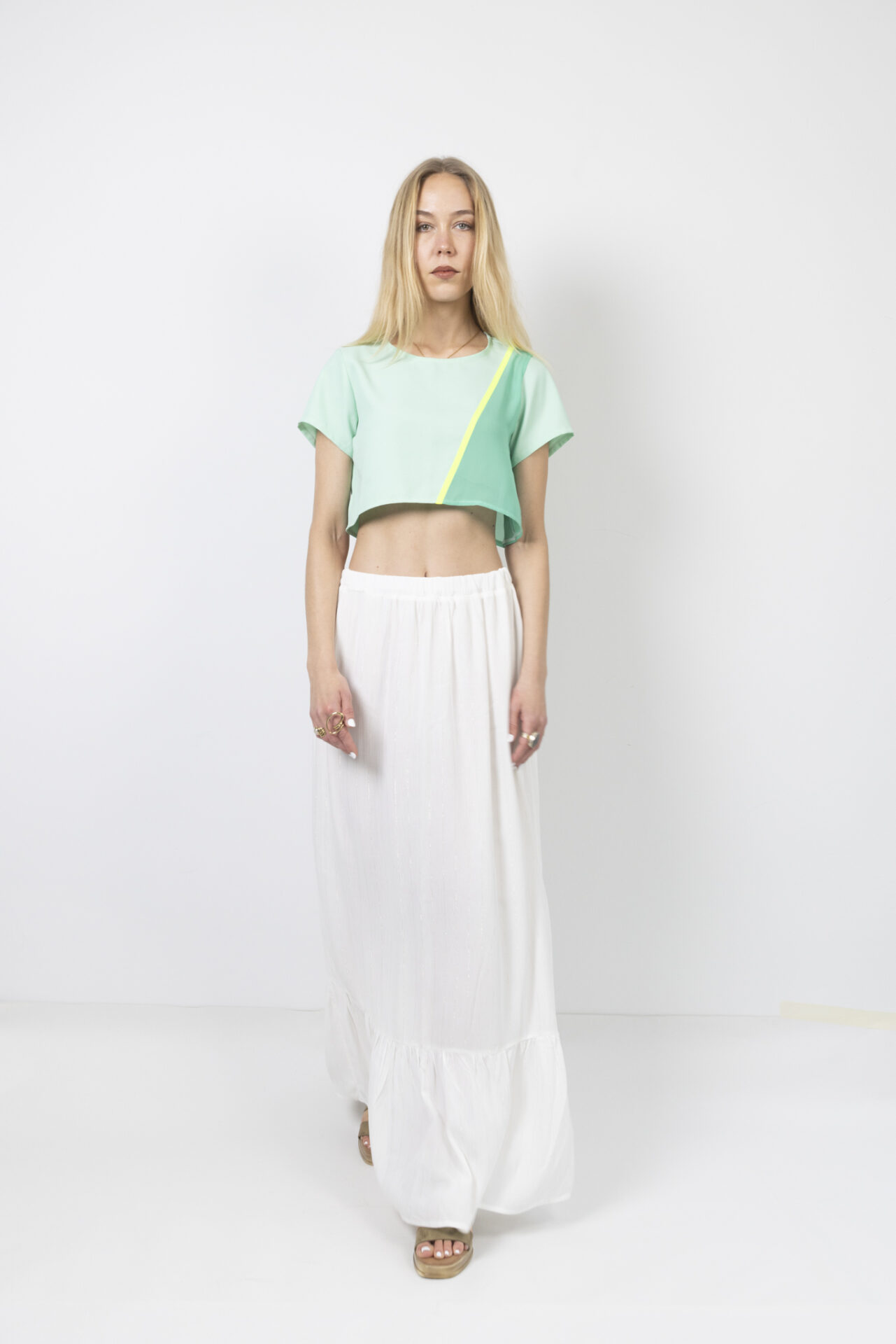 Η διαγώνια neon κίτρινη ρίγα δημιουργεί εντυπωσιακή αντίθεση, χωρίζοντας αρμονικά το ανοιχτό βεραμάν από τη βαθύτερη, ημιδιαφανή, πιο σκούρα απόχρωση.